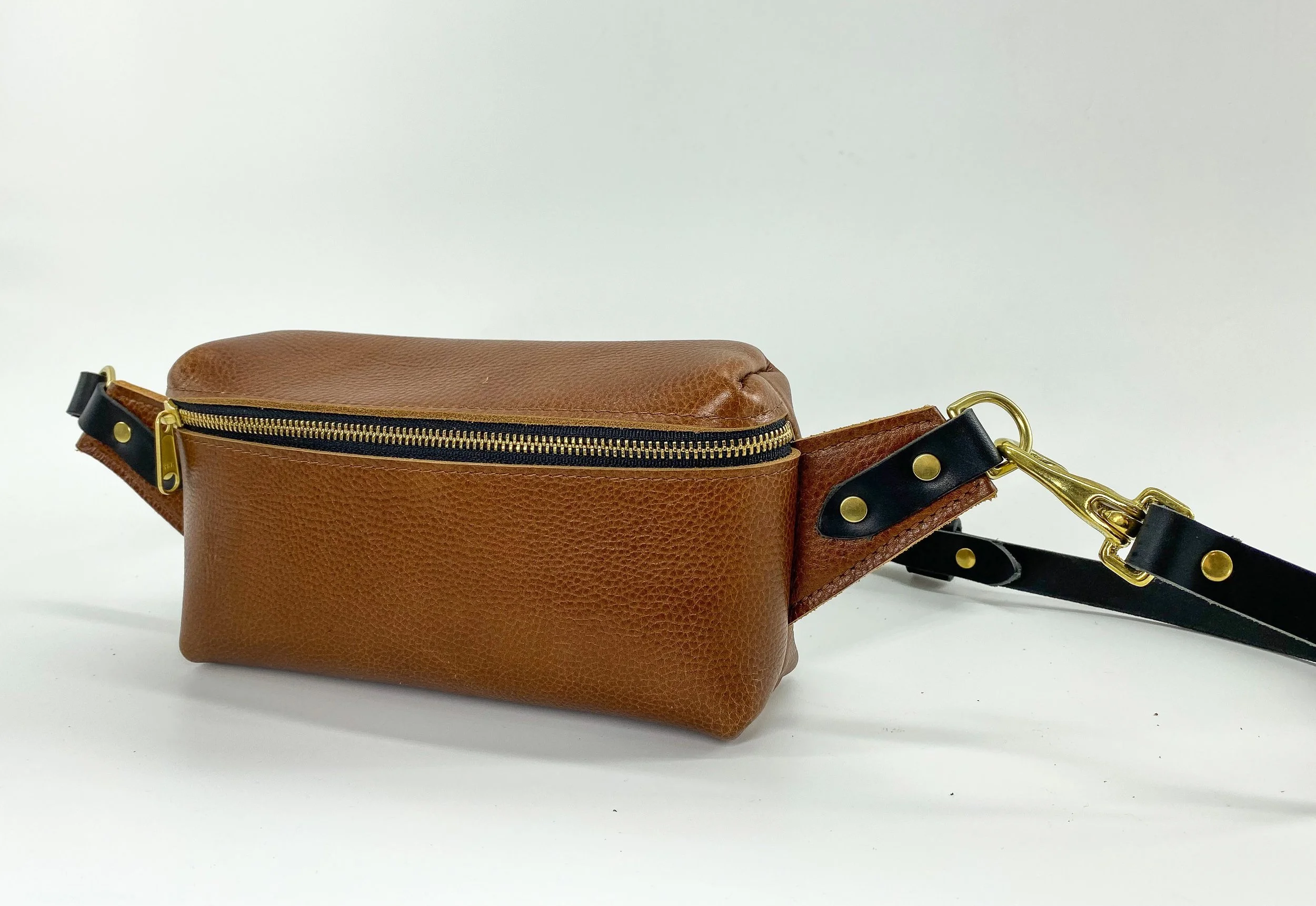 Featuring an asymmetrical zipper front, the bag securely holds a wallet, phone, keys, and any other necessary items with adjustable straps for wide flexibility in sizing.